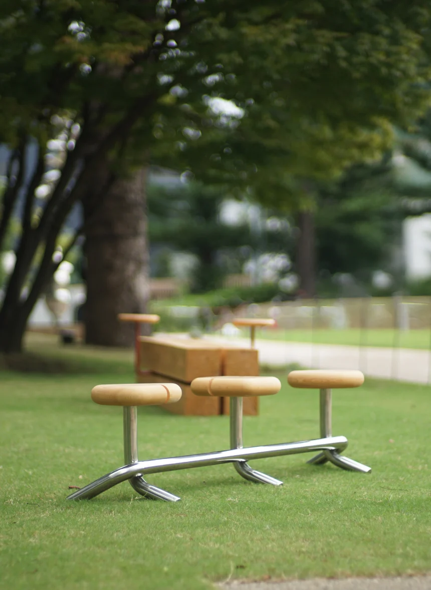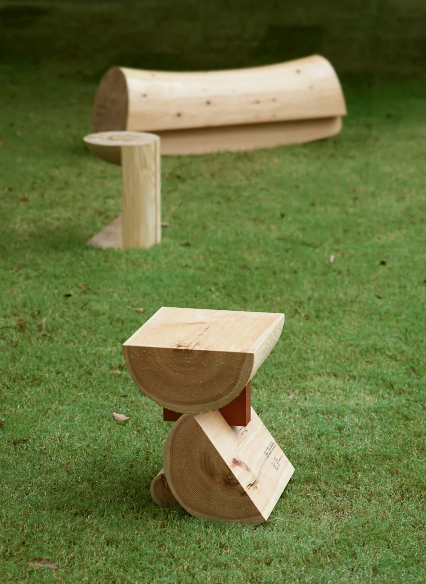 These pieces of public furniture were created to convey the vitality of the forest. For that reason, I aimed for designs that are simple and easy to understand, while also embedding my own formative experiences and feelings toward the forest. The Mushroom Bench (Ishiro_B01) is a gently rocking bench shaped as if the silhouette of a mushroom had been pressed outward. Its curved seat naturally draws two people closer together, encouraging them to sit shoulder to shoulder. The Log Stool (Ishiro_S02) was inspired by illustrations of a tree’s cross section. By carving directly from a log, flat grain, straight grain, and growth rings appear as a continuous surface, creating a three-dimensional specimen of wood that I hope children, in particular, will enjoy exploring. The Squared Timber Bench (Ishiro_B03) is based on my childhood experience of helping my grandmother cultivate shiitake mushrooms. I was also conscious of minimizing waste in the production process. I learned that furniture made for mass production often utilizes only about 30 percent of a single log through sawing and processing. This led to the idea of creating cushion-shaped wooden seating parts by slicing logs into cross sections rather than turning them into boards. For this project, three geometric seat forms—circle, triangle, and square—were combined with steel and stainless-steel legs (Ishiro_B02). This system can be expanded into various types of benches, and further developed through future collaborations with creators and manufacturers. With this project as a starting point, I hope to open up many new possibilities. Above all, I invite you to visit the Ishiro Forest, where fascinating pieces of wood lie scattered throughout, waiting to be discovered.